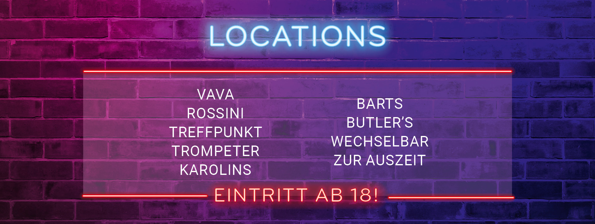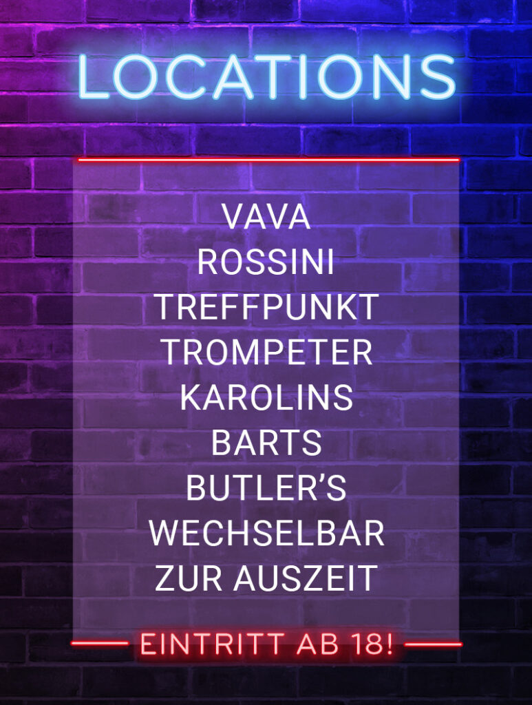 Bitte achtet darauf, dass der Einlass erst ab 18 gestattet ist – es sei denn, Ihr seid mit Euren Eltern unterwegs. Unser Personal ist verpflichtet Euer Alter vor den Kneipen zu kontrollieren!